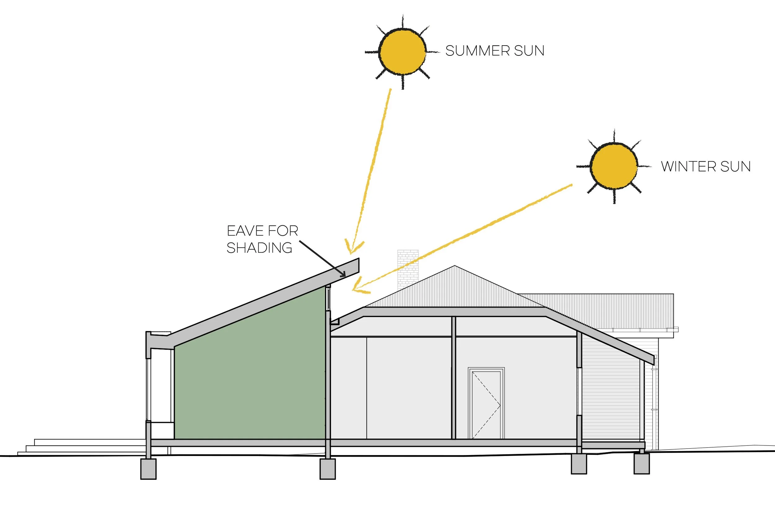 In summer, the west light can be the harshest in the afternoon. This light can also be the hardest to control, as eaves can only do so much. After a certain point in the afternoon, the sun will shine directly into the room due to the angle of the setting sun. For thermal control, these areas are best left windowless and service areas such as laundries, pantries, and storage can be placed along it to buffer the heat from the spaces you will be living and sleeping in.